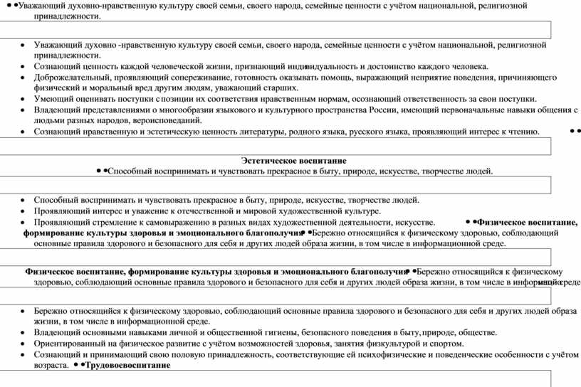 · Уважающий духовно-нравственную культуру своей семьи, своего народа, семейные ценности с учётом национальной, религиозной принадлежности. · Сознающий ценность каждой человеческой жизни, признающий индивидуальность и достоинство каждого человека. · Доброжелательный, проявляющий сопереживание, готовность оказывать помощь, выражающий неприятие поведения, причиняющего физический и моральный вред другим людям, уважающий старших. · Умеющий оценивать поступки с позиции их соответствия нравственным нормам, осознающий ответственность за свои поступки. · Владеющий представлениями о многообразии языкового и культурного пространства России, имеющий первоначальные навыки общения с людьми разных народов, вероисповеданий. · Сознающий нравственную и эстетическую ценность литературы, родного языка, русского языка, проявляющий интерес к чтению. |