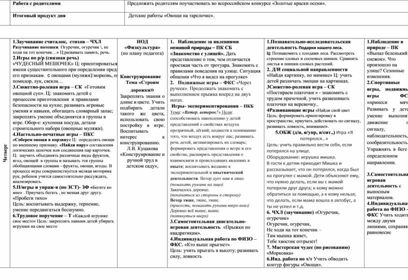 1. «Мастерская добрых дел» – Самостоятельная творческая деятельность –Х/ТК Выставка рисунков «овощи на тарелочке» 2.Развивающие игры «Что растет на дереве, а что растет на грядке» развивать умения отличать и называть по внешнему виду овощи и фрукты. 3. Игры с конструктором – ПСКХТ Строительство забора в огороде. Ц: учить использовать в игре деревянные и пластмассовые конструкторы; учить строить по образцу, развивать навыки совместной деятельности. 4.Театр. д-ть (драм., имитации, импровизации) «Кто из нас, из овощей…»Обогащать эмоции; вовлекать в импровизацию. Учить обсуждать содержание сказки. 5.ЧХЛ (заучивание) стихотворения В.Берестова «Бычок». Маленький бычок, /Желтенький бочок, /Ножками ступает, /Головой мотает: /- Где же стадо? Му-у-у! /Скучно одному-у! 6. Мастерская чудес. (Аппликация). «Овощи на тарелочке». Воспитывать самостоятельность в выполнении задания; учить наклеивать готовые формы в определенных частях листа. 5. Инд. работа по РМП Закреплять умение определять форму предмета (шар, куб) с Султаном Х. |