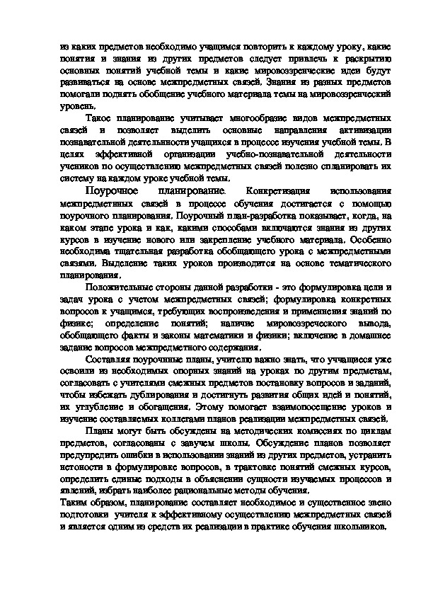 планирование межпредметных связей, особенно в узловых учебных целях.