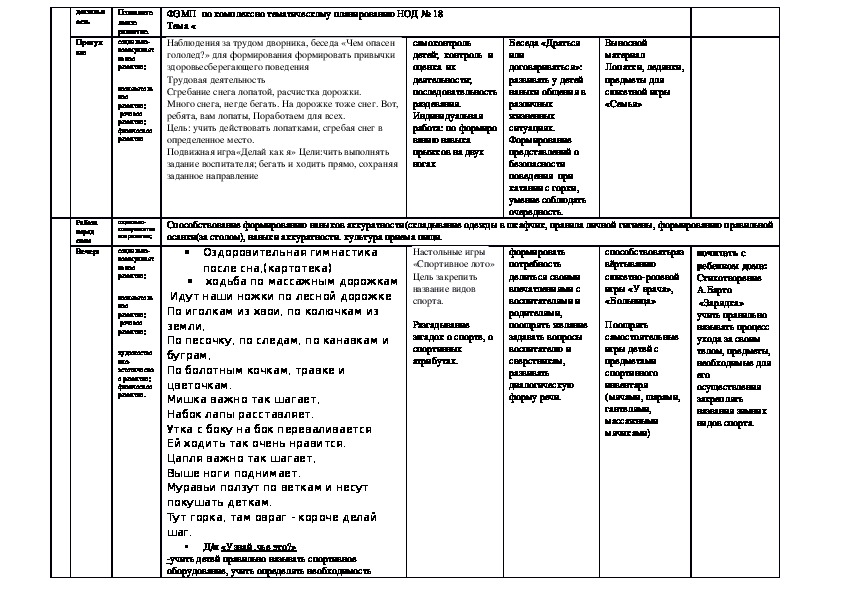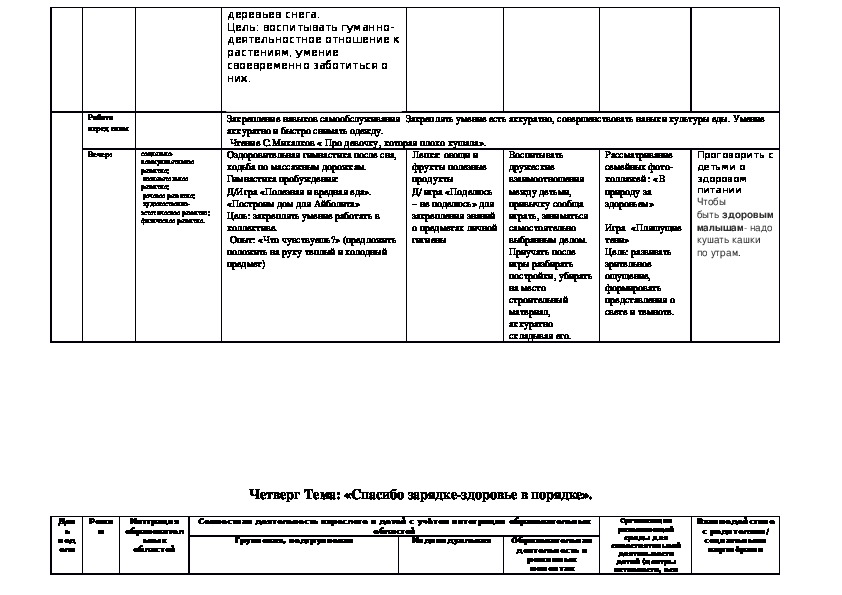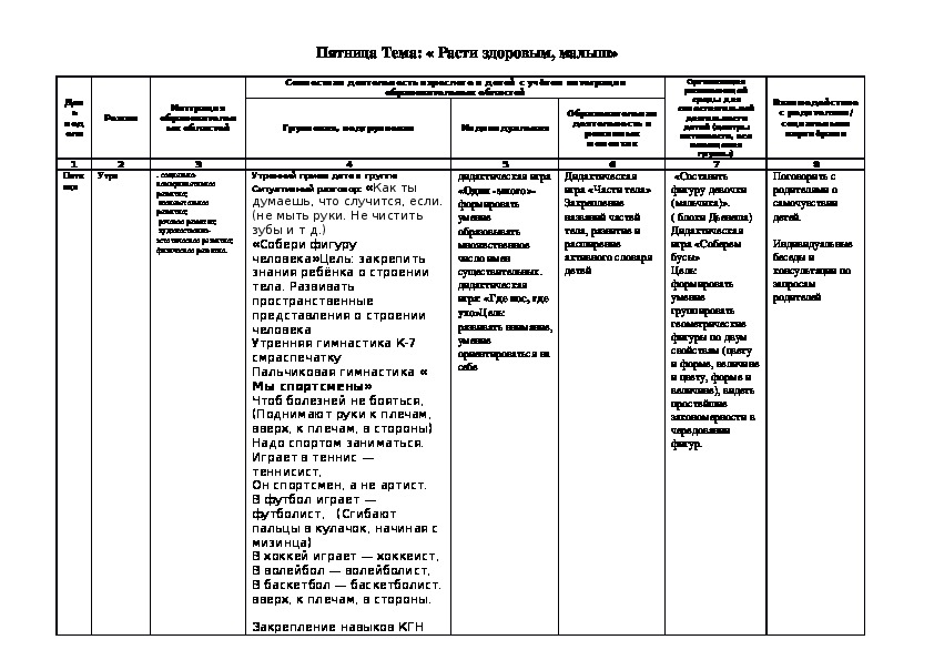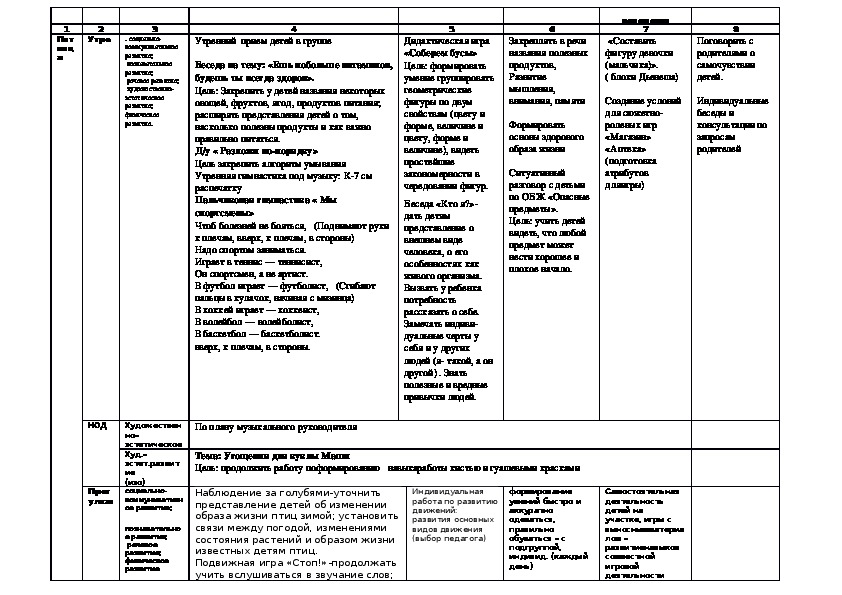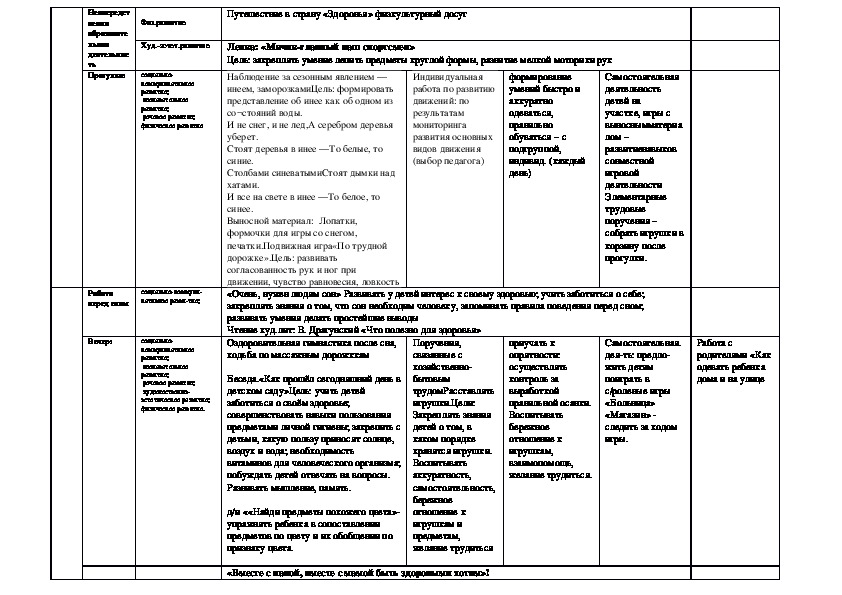 Данный материал несет в себе планирование по дням недели "За здоровьем в детский сад". Целью планирования можно выделить: формирование представление о здоровье, его значении, способах сохранения и укрепления; формировать представление о ценности здоровья, желание вести здоровый образ жизни. подробное планирование всех дней недели.