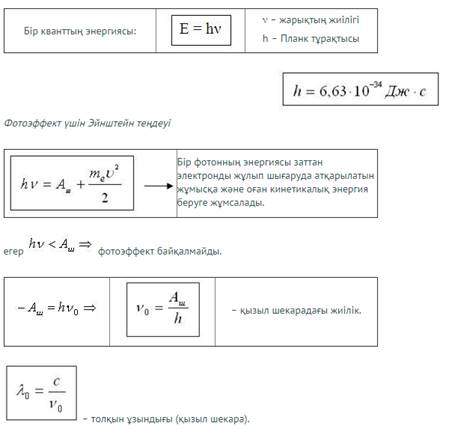 Оқушылар сабақ барысында абсолют қара денені анықтауды,Стефан-Больцман заңын;Вин заңын меңгереді. Фотоэффект құбылысын сипаттайды, толқынның ұзындығын есептейді, шығу жұмысын есептейді және Планк тұрақтысын анықтау үшін тәжірибелік өлшеулерді қолданады. |