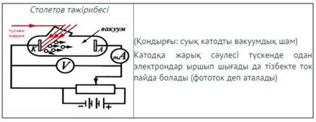 түрлі жерде болады. Фотоэффект деп түскен жарықтың әсерінен заттан (металдар мен сұйықтардан) элеткрондардың ұшып шығу құбылысын айтамыз. Құбылысты 1887 жылы Г.Герц ашты,Фотоэффект құбылысын тәжірибе жүзінде зерттеген Столетов болды.