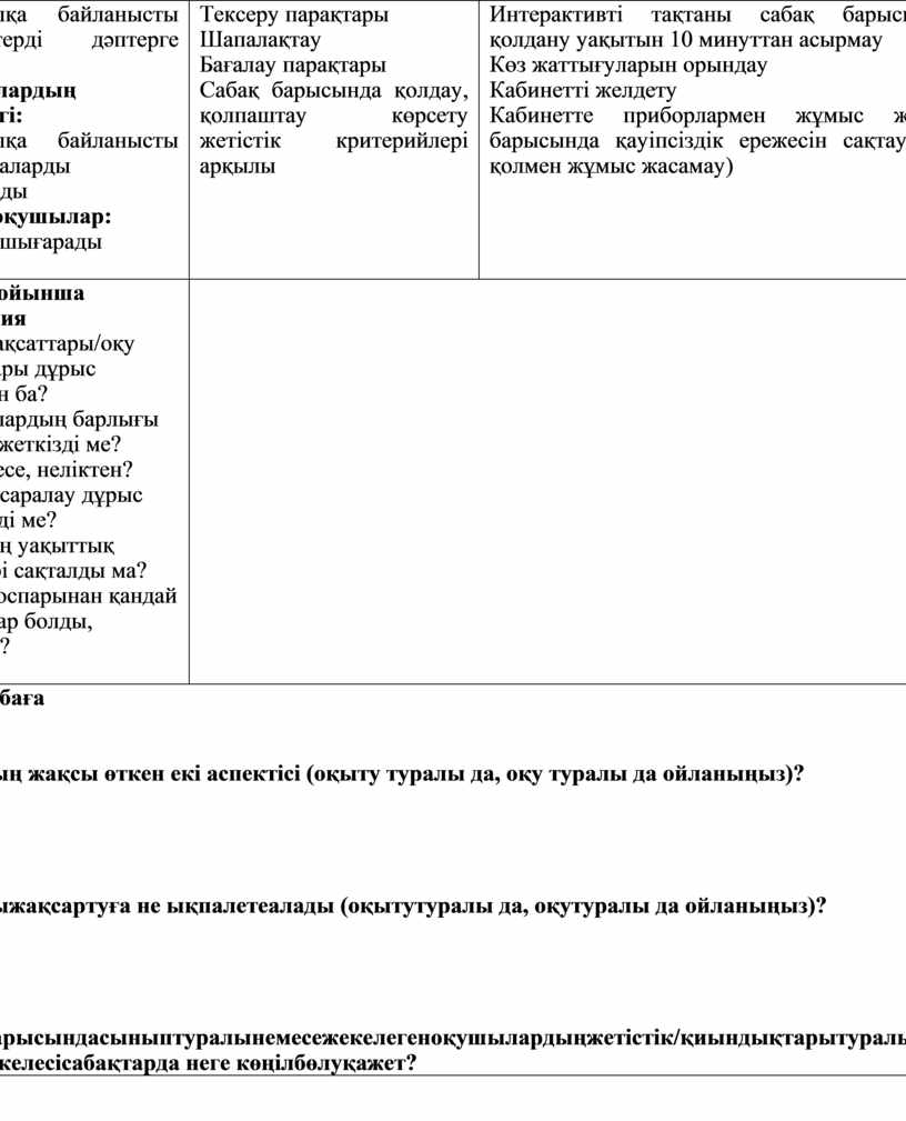 Сабақ бойынша рефлексия Сабақ мақсаттары/оқу мақсаттары дұрыс қойылған ба? Оқушылардың барлығы ОМ қол жеткізді ме? Жеткізбесе, неліктен? Сабақта саралау дұрыс жүргізілді ме? Сабақтың уақыттық кезеңдері сақталды ма? Сабақ жоспарынан қандай ауытқулар болды, неліктен?