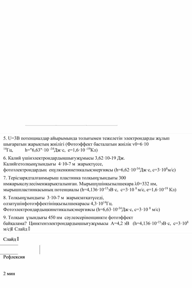 1. 5. U=3B потенциалдар айырымында толығымен тежелетін электрондарды жұлып шығаратын жарықтың жиілігі (Фотоэффект басталатын жиілік v0=6·10 14Гц, h="6,63"·10 -34Дж·с, е=1,6·10 -19Кл) 2. 6. Калий үшінэлектрондардыңшығужұмысы 3,62·10-19 Дж. Калийгетолқынұзындығы 4·10-7 м жарықтүссе, фотоэлектрондардың еңүлкенкинетикалықэнергиясы (h=6,62·10-34Дж·с, с=3·108м/с) 3. 7. Терісзарядталғанмырыш пластинка толқынұзындығы 300 нмжарықсәулесіменжарықталынған. Мырышүшінқызылшекара λ0=332 нм, мырышпластинкасының потенциалы (h=4,136·10-15эВ·с, с=3·10 8 м/с, е=1,6·10-19 Кл) 4. 8. Толқынұзындығы 3·10-7 м жарықзатқатүседі, олзатүшінфотоэффектініңқызылшекарасы 4,3·1014Гц. Фотоэлектрондардыңкинетикалықэнергиясы (h=6,63·10-34Дж·с, с=3·10 8 м/с) 5. 9. Толқын ұзындығы 450 нм сәулеәсеріненцинкте фотоэффект байқалама? Цинктенэлектрондардыңшығужұмысы А=4,2 эВ (h=4,136·10-15эВ·с, с=3·108 м/с) |