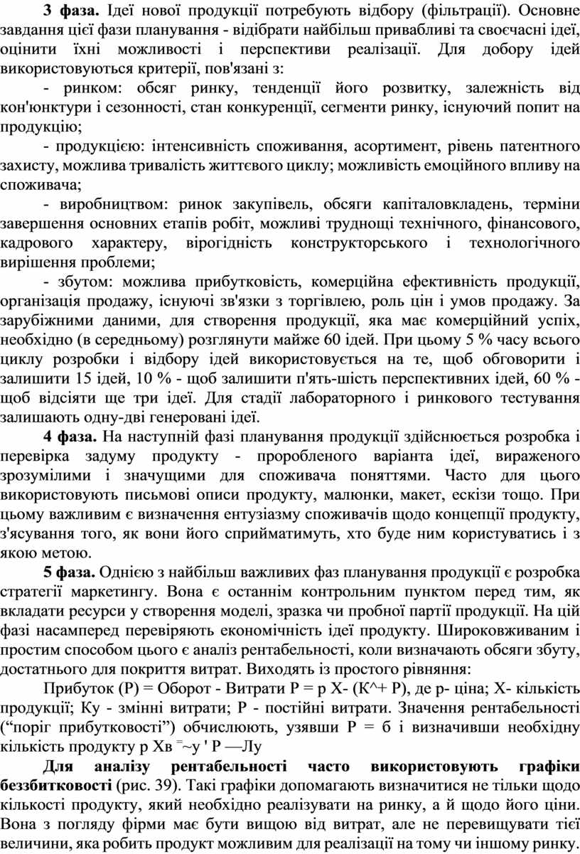 Для аналізу рентабельності часто використовують графіки беззбитковості (рис. 39). Такі графіки допомагають визначитися не тільки щодо кількості продукту, який необхідно реалізувати на ринку, а й щодо його ціни. Вона з погляду фірми має бути вищою від витрат, але не перевищувати тієї величини, яка робить продукт можливим для реалізації на тому чи іншому ринку.