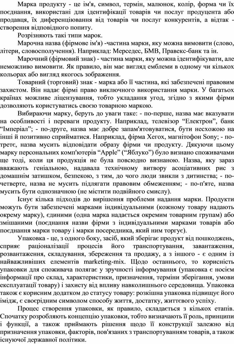 Марка продукту - це ім'я, символ, термін, малюнок, колір, форма чи їх поєднання, використані для ідентифікації товарів чи послуг продуцента або продавця, їх диференціювання від товарів чи послуг конкурентів, а відтак - створення відповідного попиту.