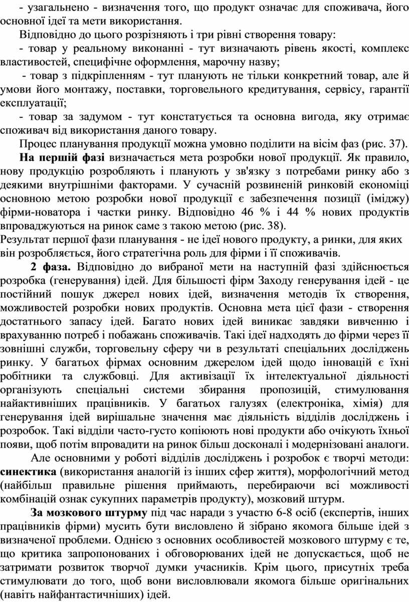 2 фаза. Відповідно до вибраної мети на наступній фазі здійснюється розробка (генерування) ідей. Для більшості фірм Заходу генерування ідей - це постійний пошук джерел нових ідей, визначення методів їх створення, можливостей розробки нових продуктів. Основна мета цієї фази - створення достатнього запасу ідей. Багато нових ідей виникає завдяки вивченню і врахуванню потреб і побажань споживачів. Такі ідеї надходять до фірми через її зовнішні служби, торговельну сферу чи в результаті спеціальних досліджень ринку. У багатьох фірмах основним джерелом ідей щодо інновацій є їхні робітники та службовці. Для активізації їх інтелектуальної діяльності організують спеціальні системи збирання пропозицій, стимулювання найактивніших працівників. У багатьох галузях (електроніка, хімія) для генерування ідей вирішальне значення має діяльність відділів досліджень і розробок. Такі відділи часто-густо копіюють нові продукти або очікують їхньої появи, щоб потім впровадити на ринок більш досконалі і модернізовані аналоги.