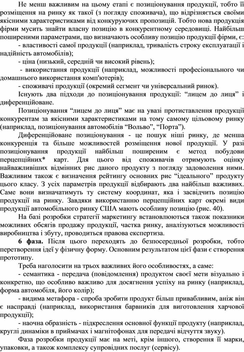 Диференційоване позиціонування - це пошук ніші ринку, де менша конкуренція та більше можливостей розміщення нової продукції. У разі позиціонування продукції найбільш поширеним є метод побудови перцепційних* карт. Для цього від споживачів отримують оцінку найважливіших відмінних рис даного продукту з погляду задоволення ними. Важливим також є визначення рейтингу основних рис “ідеального” продукту цього класу. З усіх параметрів продукції відбирають два найбільш важливих. Саме вони визначатимуть ту систему координат, яка і засвідчить позицію продукції на ринку. Завдяки використанню перцепційних карт окремі види продукції автомобільного ринку США мають особливу позицію (рис. 40).