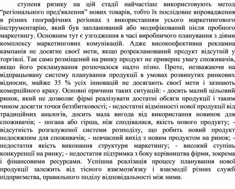 8 фаза. Остання фаза планування продукції - розгортання виробництва і комерційної реалізації продукції. Тут треба взяти до уваги те, що темпи зростання і загальний рівень збуту нової продукції залежать від двох взаємопов'язаних процесів поведінки споживачів. Один з них - процес визнання продукції - поведінка і дії окремих споживачів щодо визнання й купівлі нових товарів. Цей процес, як правило, має такі стадії: знання (про товар, його унікальні властивості, вигоди від його використання); переконання (в необхідності придбання і використання); рішення (щодо часу й ціни купівлі);підтвердження (очікуваних сподівань щодо можливостей придбання товару); реалізація угод купівлі-продажу. Другий процес — розповсюдження продукції, тобто час від впровадження до насичення ринку новим товаром. Для зниження витрат і ступеня ризику на цій стадії найчастіше використовують метод “регіонального пред'явлення” нових товарів, тобто їх послідовне впровадження в різних географічних регіонах з використанням усього маркетингового інструментарію, який був запланований або модифікований після пробного маркетингу. Основним тут є узгодження в часі виробничого планування з діями комплексу маркетингових комунікацій. Адже високоефективна рекламна кампанія не досягне своєї мети, якщо розрекламований продукт відсутній у торгівлі. Так само розміщений на ринку продукт не приверне увагу споживачів, якщо його рекламування розпочалося надто пізно. Проте, незважаючи на відпрацьовану систему планування продукції в умовах розвинутих ринкових відносин, майже 35 % усіх інновацій не досягають своєї мети і зазнають комерційного краху. Основні причини таких ситуацій: - досить малий цільовий ринок, який не дозволяє фірмі реалізувати достатні обсяги продукції і таким чином досягти точки беззбитковості; - недостатні відмінності нової продукції від традиційних аналогів, досить мала вигода від використання новинок для споживачів; - погана або гірша, ніж сподівалися, якість нового продукту; - відсутність розгалуженої системи розподілу, що робить новий продукт недосяжним для споживачів; - невчасний вихід з новим продуктом на ринок; - недостатня якість виконання структури маркетингу; - високий ступінь конкуренції на ринку; - недостатня підтримка з боку керівництва фірми, зокрема і фінансовими ресурсами. Успішна реалізація процесу планування нової продукції залежить від тісного взаємозв'язку і взаємодії різних служб підприємства, правильного поділу відповідальності між ними.