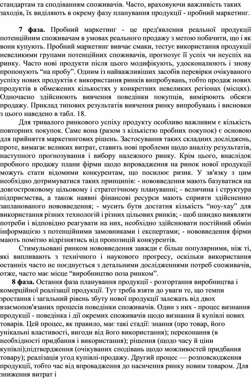 7 фаза. Пробний маркетинг - це пред'явлення реальної продукції потенційним споживачам в умовах реального продажу з метою побачити, що і як вони купують. Пробний маркетинг вивчає смаки, тестує використання продукції невеликими групами потенційних споживачів, прогнозує її успіх чи неуспіх на ринку. Часто нові продукти після цього модифікують, удосконалюють і знову пропонують “на пробу”. Одним із найважливіших засобів перевірки очікуваного успіху нових продуктів є використання ринків випробувань, тобто продаж нових продуктів в обмежених кількостях у конкретних невеликих регіонах (місцях). Одночасно здійснюють вивчення поведінки покупців, вимірюють обсяги продажу. Приклад типових результатів вивчення ринку випробувань і висновки з цього наведено в табл. 18.