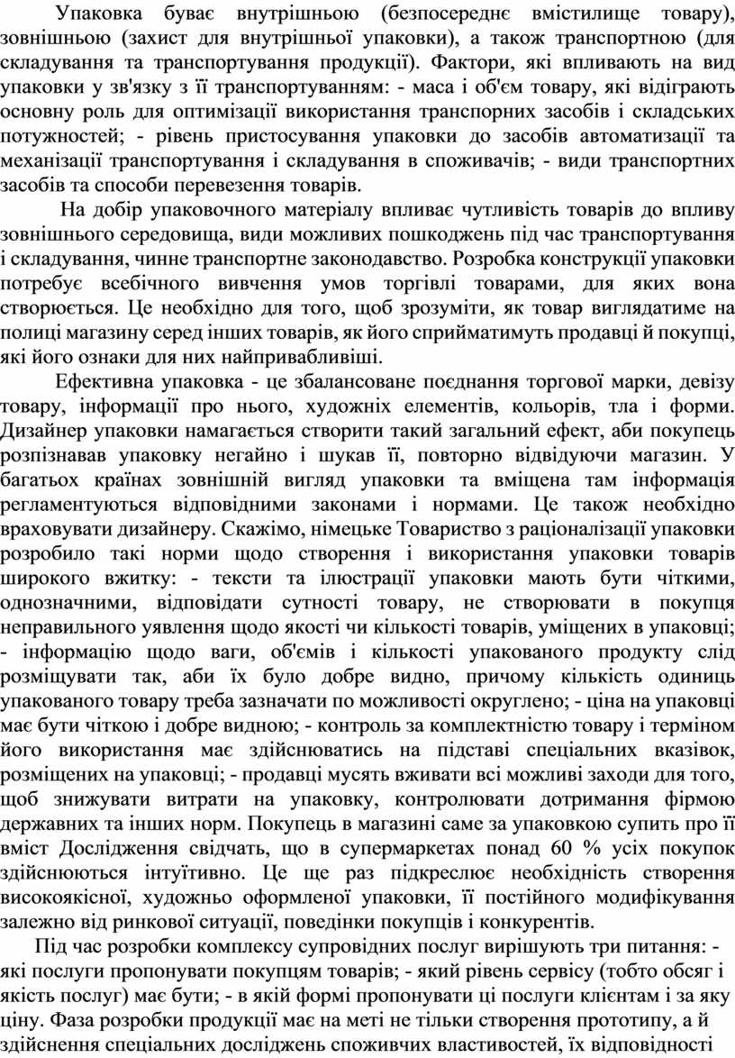 Ефективна упаковка - це збалансоване поєднання торгової марки, девізу товару, інформації про нього, художніх елементів, кольорів, тла і форми. Дизайнер упаковки намагається створити такий загальний ефект, аби покупець розпізнавав упаковку негайно і шукав її, повторно відвідуючи магазин. У багатьох країнах зовнішній вигляд упаковки та вміщена там інформація регламентуються відповідними законами і нормами. Це також необхідно враховувати дизайнеру. Скажімо, німецьке Товариство з раціоналізації упаковки розробило такі норми щодо створення і використання упаковки товарів широкого вжитку: - тексти та ілюстрації упаковки мають бути чіткими, однозначними, відповідати сутності товару, не створювати в покупця неправильного уявлення щодо якості чи кількості товарів, уміщених в упаковці; - інформацію щодо ваги, об'ємів і кількості упакованого продукту слід розміщувати так, аби їх було добре видно, причому кількість одиниць упакованого товару треба зазначати по можливості округлено; - ціна на упаковці має бути чіткою і добре видною; - контроль за комплектністю товару і терміном його використання має здійснюватись на підставі спеціальних вказівок, розміщених на упаковці; - продавці мусять вживати всі можливі заходи для того, щоб знижувати витрати на упаковку, контролювати дотримання фірмою державних та інших норм. Покупець в магазині саме за упаковкою супить про її вміст Дослідження свідчать, що в супермаркетах понад 60 % усіх покупок здійснюються інтуїтивно. Це ще раз підкреслює необхідність створення високоякісної, художньо оформленої упаковки, її постійного модифікування залежно від ринкової ситуації, поведінки покупців і конкурентів.