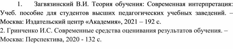1. Загвязинский В.И. Теория обучения: Современная интерпретация: Учеб. пособие для студентов высших педагогических учебных заведений. – Москва: Издательский центр «Академия», 2021 – 192 с.