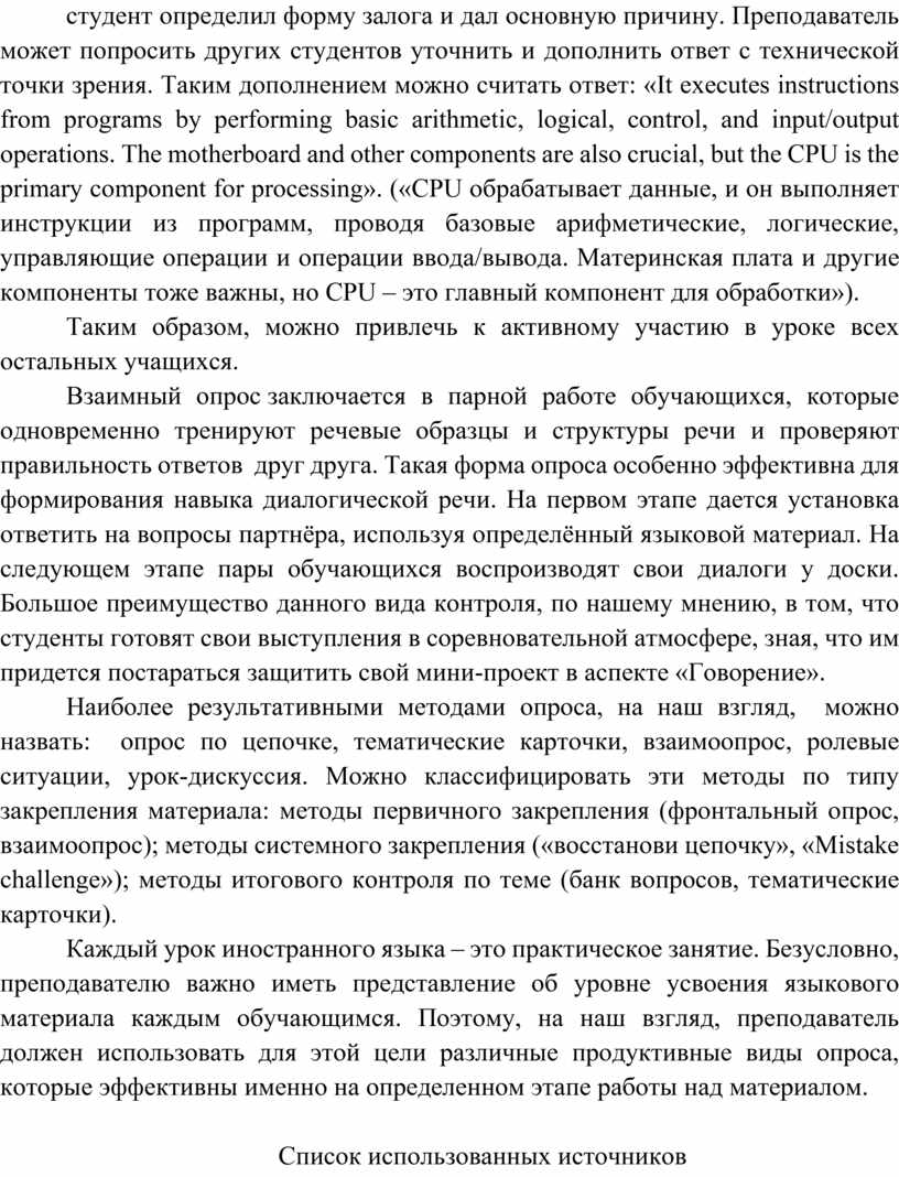 Наиболее результативными методами опроса, на наш взгляд, можно назвать: опрос по цепочке, тематические карточки, взаимоопрос, ролевые ситуации, урок-дискуссия. Можно классифицировать эти методы по типу закрепления материала: методы первичного закрепления (фронтальный опрос, взаимоопрос); методы системного закрепления («восстанови цепочку», «Mistake challenge»); методы итогового контроля по теме (банк вопросов, тематические карточки).