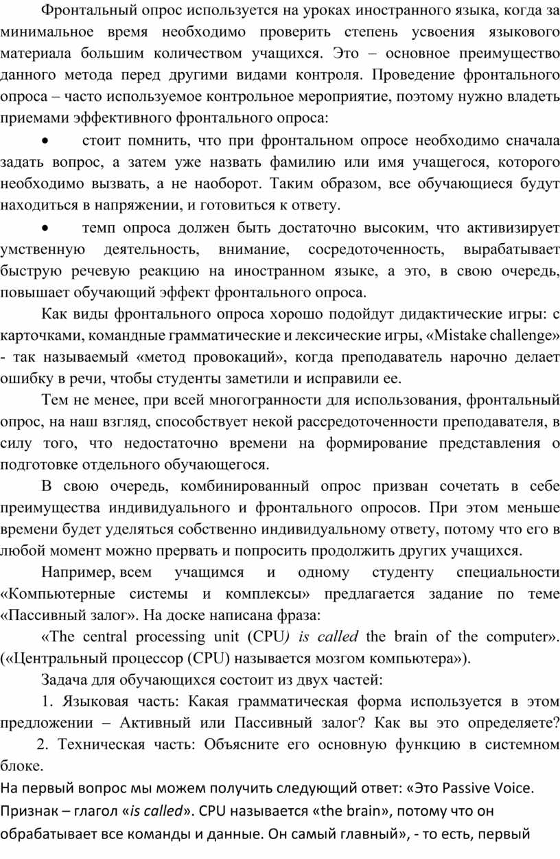 Фронтальный опрос используется на уроках иностранного языка, когда за минимальное время необходимо проверить степень усвоения языкового материала большим количеством учащихся. Это – основное преимущество данного метода перед другими видами контроля. Проведение фронтального опроса – часто используемое контрольное мероприятие, поэтому нужно владеть приемами эффективного фронтального опроса: