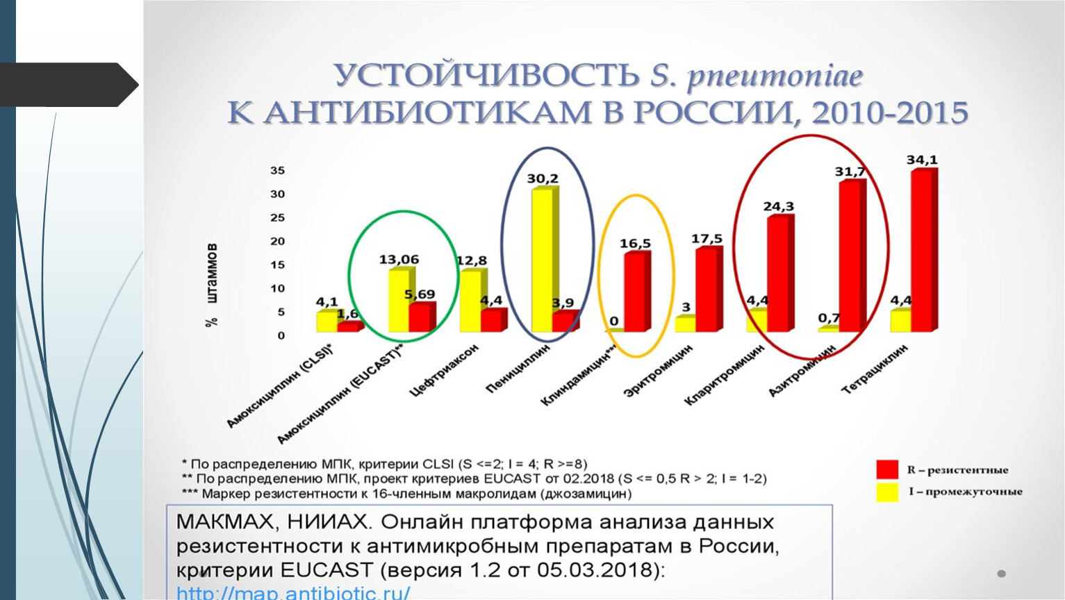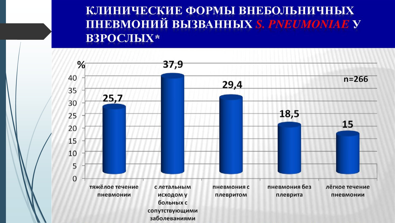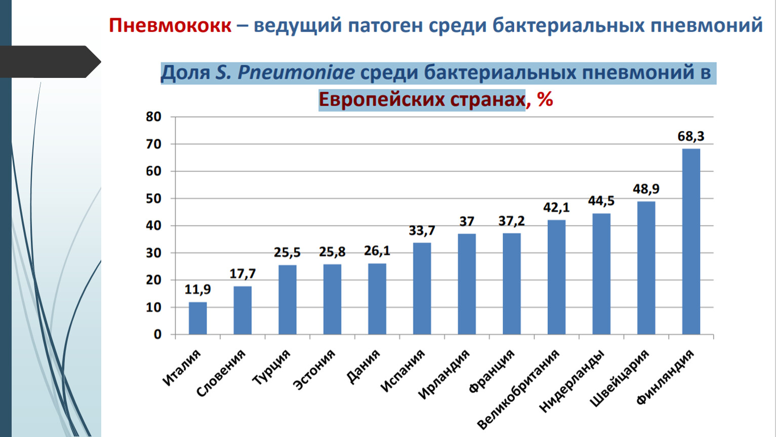 Пневмококк – ведущий патоген среди бактериальных пневмоний Доля S. Pneumoniae среди бактериальных пневмоний, %