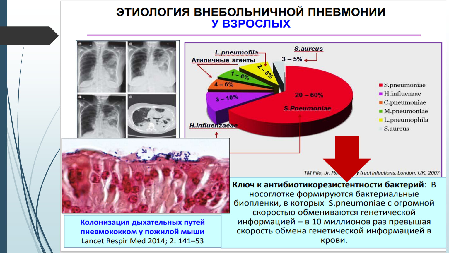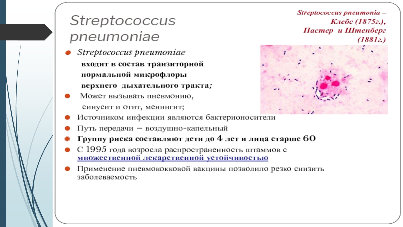 • S. pneumoniae обитает на слизистой оболочке носоглотки и может мигрировать в легкие, где вызывает пневмонию