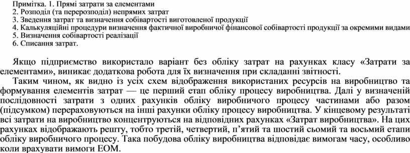 Таким чином, як видно із усіх схем відображення використаних ресурсів на виробництво та формування елементів затрат — це перший етап обліку процесу виробництва. Далі у визначеній послідовності затрати з одних рахунків обліку виробничого процесу частинами або разом (підсумком) перераховуються на інші рахунки обліку процесу виробництва. У кінцевому результаті всі затрати на виробництво концентруються на відповідних рахунках «Затрат виробництва». На цих рахунках відображають решту, тобто третій, четвертий, п’ятий та шостий сьомий та восьмий етапи обліку виробничого процесу. Така побудова обліку виробництва відповідає вимогам часу, особливо коли врахувати вимоги ЕОМ.