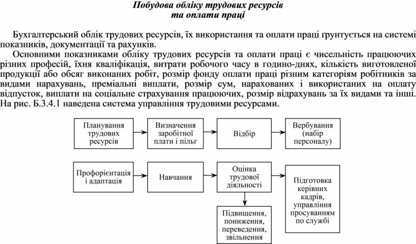 Основними показниками обліку трудових ресурсів та оплати праці є чисельність працюючих різних професій, їхня кваліфікація, витрати робочого часу в годино-днях, кількість виготовленої продукції або обсяг виконаних робіт, розмір фонду оплати праці різним категоріям робітників за видами нарахувань, преміальні виплати, розмір сум, нарахованих і використаних на оплату відпусток, виплати на соціальне страхування працюючих, розмір відрахувань за їх видами та інші. На рис. Б.3.4.1 наведена система управління трудовими ресурсами.