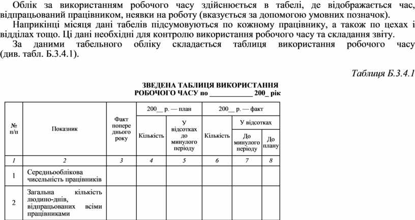 За даними табельного обліку складається таблиця використання робочого часу (див. табл. Б.3.4.1).