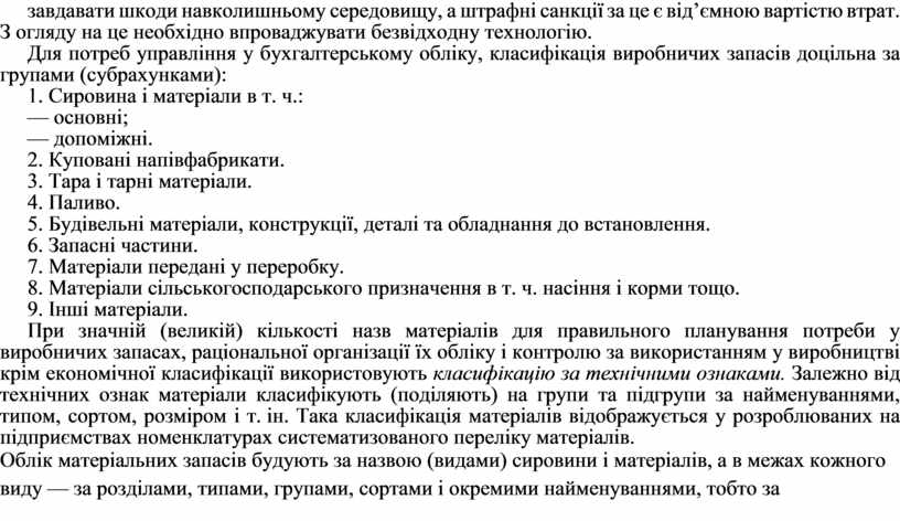 Для потреб управління у бухгалтерському обліку, класифікація виробничих запасів доцільна за групами (субрахунками):