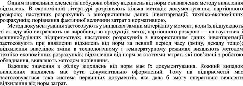 Одним із важливих елементів побудови обліку відхилень від норм є визначення методу виявлення відхилень. В економічній літературі розрізняють кілька методів: документування; партіонного розкрою; наступних розрахунків з використанням даних інвентаризації; техніко-економічних розрахунків; порівняння фактичної величини затрат з нормативною.