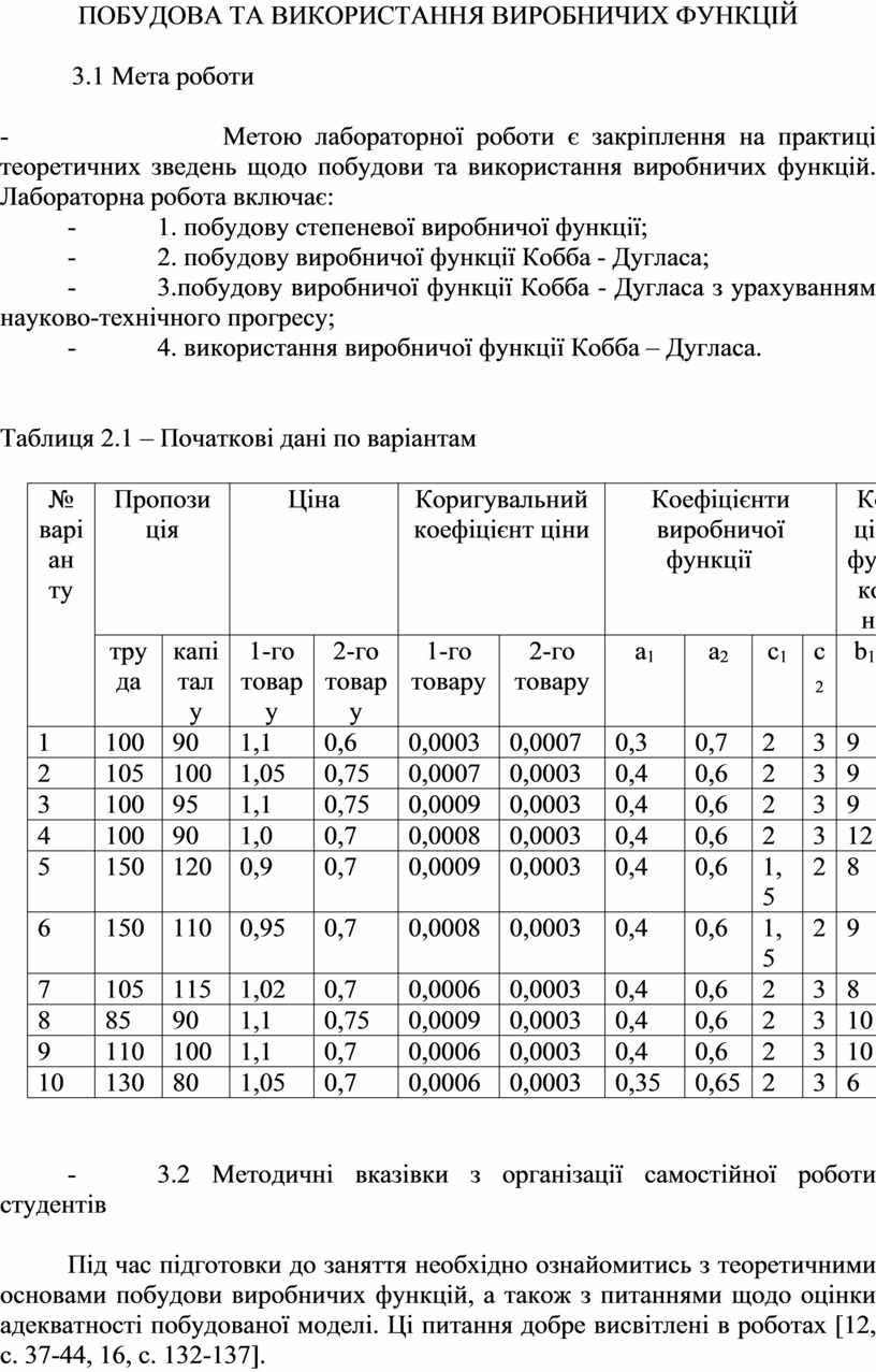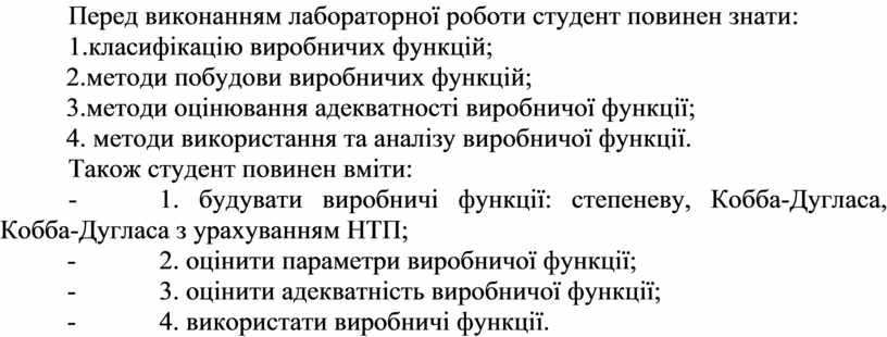 - 1. будувати виробничі функції: степеневу, Кобба-Дугласа, Кобба-Дугласа з урахуванням НТП;