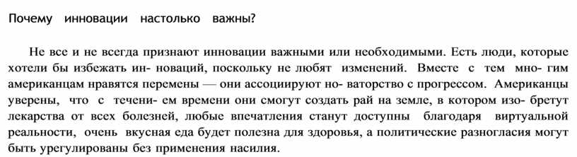 Не все и не всегда признают инновации важными или необходимыми. Есть люди, которые хотели бы избежать ин новаций, поскольку не любят изменений. Вместе с тем мно гим американцам нравятся перемены — они ассоциируют но ваторство с прогрессом. Американцы уверены, что с течени ем времени они смогут создать рай на земле, в котором изо бретут лекарства от всех болезней, любые впечатления станут доступны благодаря виртуальной реальности, очень вкусная еда будет полезна для здоровья, а политические разногласия могут быть урегулированы без применения насилия.