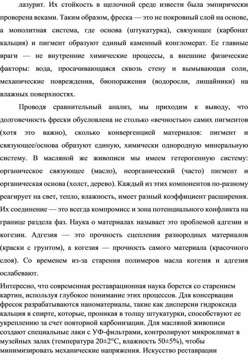 Проводя сравнительный анализ, мы приходим к выводу, что долговечность фрески обусловлена не столько «вечностью» самих пигментов (хотя это важно), сколько конвергенцией материалов: пигмент и связующее/основа образуют единую, химически однородную минеральную систему. В масляной же живописи мы имеем гетерогенную систему: органическое связующее (масло), неорганический (часто) пигмент и органическая основа (холст, дерево). Каждый из этих компонентов по-разному реагирует на свет, тепло, влажность, имеет разный коэффициент расширения. Их соединение — это всегда компромисс и зона потенциального конфликта на границе раздела фаз. Наука о материалах называет это проблемой адгезии и когезии. Адгезия — это прочность сцепления разнородных материалов (краски с грунтом), а когезия — прочность самого материала (красочного слоя). Со временем из-за старения полимеров масла когезия и адгезия ослабевают.