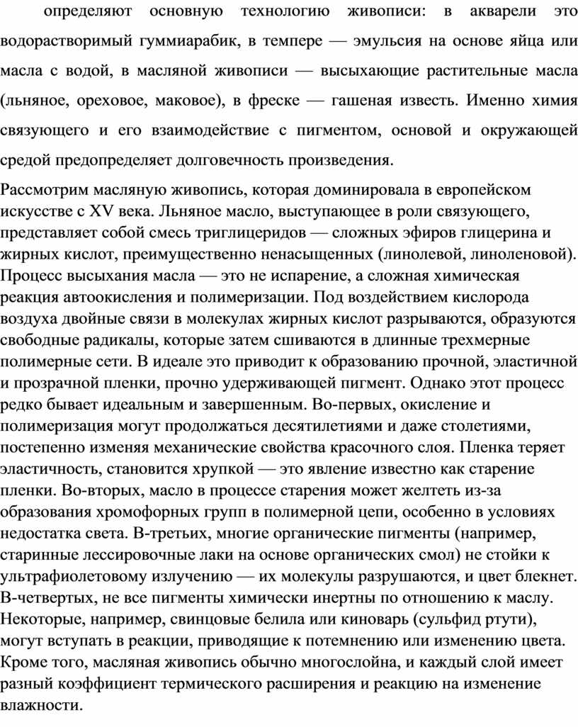 Рассмотрим масляную живопись, которая доминировала в европейском искусстве с XV века. Льняное масло, выступающее в роли связующего, представляет собой смесь триглицеридов — сложных эфиров глицерина и жирных кислот, преимущественно ненасыщенных (линолевой, линоленовой). Процесс высыхания масла — это не испарение, а сложная химическая реакция автоокисления и полимеризации. Под воздействием кислорода воздуха двойные связи в молекулах жирных кислот разрываются, образуются свободные радикалы, которые затем сшиваются в длинные трехмерные полимерные сети. В идеале это приводит к образованию прочной, эластичной и прозрачной пленки, прочно удерживающей пигмент. Однако этот процесс редко бывает идеальным и завершенным. Во-первых, окисление и полимеризация могут продолжаться десятилетиями и даже столетиями, постепенно изменяя механические свойства красочного слоя. Пленка теряет эластичность, становится хрупкой — это явление известно как старение пленки. Во-вторых, масло в процессе старения может желтеть из-за образования хромофорных групп в полимерной цепи, особенно в условиях недостатка света. В-третьих, многие органические пигменты (например, старинные лессировочные лаки на основе органических смол) не стойки к ультрафиолетовому излучению — их молекулы разрушаются, и цвет блекнет. В-четвертых, не все пигменты химически инертны по отношению к маслу. Некоторые, например, свинцовые белила или киноварь (сульфид ртути), могут вступать в реакции, приводящие к потемнению или изменению цвета. Кроме того, масляная живопись обычно многослойна, и каждый слой имеет разный коэффициент термического расширения и реакцию на изменение влажности. Это приводит к внутренним напряжениям, растрескиванию (кракелюрам), а иногда и отслоению красочного слоя от грунта или холста. Холст, будучи органическим материалом (льняным или хлопковым), также подвержен деградации: он гигроскопичен, реагирует на колебания влажности, может поражаться микроорганизмами. Таким образом, масляная картина — это сложная композитная система, находящаяся в состоянии непрерывного, хотя и крайне медленного, химического и физического изменения.