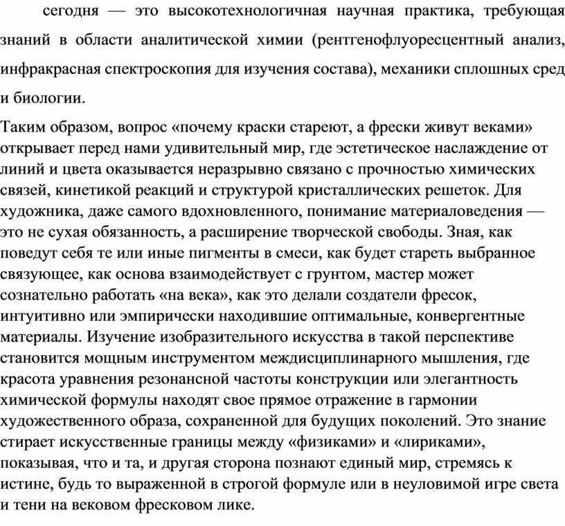 Таким образом, вопрос «почему краски стареют, а фрески живут веками» открывает перед нами удивительный мир, где эстетическое наслаждение от линий и цвета оказывается неразрывно связано с прочностью химических связей, кинетикой реакций и структурой кристаллических решеток. Для художника, даже самого вдохновленного, понимание материаловедения — это не сухая обязанность, а расширение творческой свободы. Зная, как поведут себя те или иные пигменты в смеси, как будет стареть выбранное связующее, как основа взаимодействует с грунтом, мастер может сознательно работать «на века», как это делали создатели фресок, интуитивно или эмпирически находившие оптимальные, конвергентные материалы. Изучение изобразительного искусства в такой перспективе становится мощным инструментом междисциплинарного мышления, где красота уравнения резонансной частоты конструкции или элегантность химической формулы находят свое прямое отражение в гармонии художественного образа, сохраненной для будущих поколений. Это знание стирает искусственные границы между «физиками» и «лириками», показывая, что и та, и другая сторона познают единый мир, стремясь к истине, будь то выраженной в строгой формуле или в неуловимой игре света и тени на вековом фресковом лике.