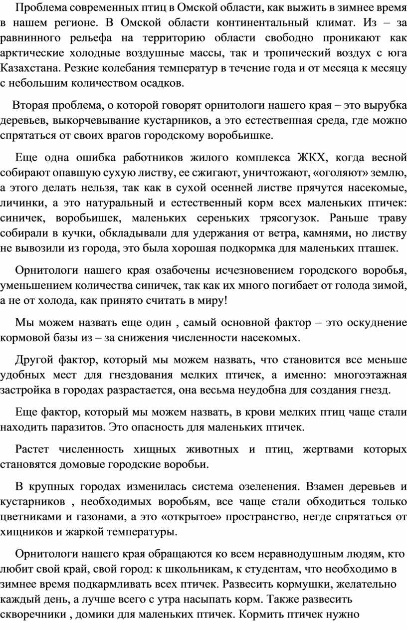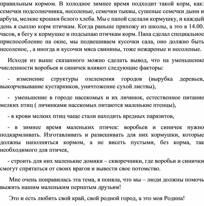Орнитологи нашего края обращаются ко всем неравнодушным людям, кто любит свой край, свой город: к школьникам, к студентам, что необходимо в зимнее время подкармливать всех птичек. Развесить кормушки, желательно каждый день, а лучше всего с утра насыпать корм. Также развесить скворечники , домики для маленьких птичек. Кормить птичек нужно правильным кормом. В холодное зимнее время подходит такой корм, как: семечки подсолнечника, несоленые, семечки тыквы, сушеные семечки дыни и арбуза, мелкие крошки белого хлеба. Мы с папой сделали кормушку, и каждый день я сыплю корм птичкам. Когда раньше прихожу из школы, а это в 14.00. часов, я бегу к кормушке и подсыпаю птичкам корм. Папа сделал специальное приспособление на окне, мы подвешиваем кусочки сала, оно должно быть несоленое, , а иногда и кусочки мяса свинины, тоже нежареные и несоленые.