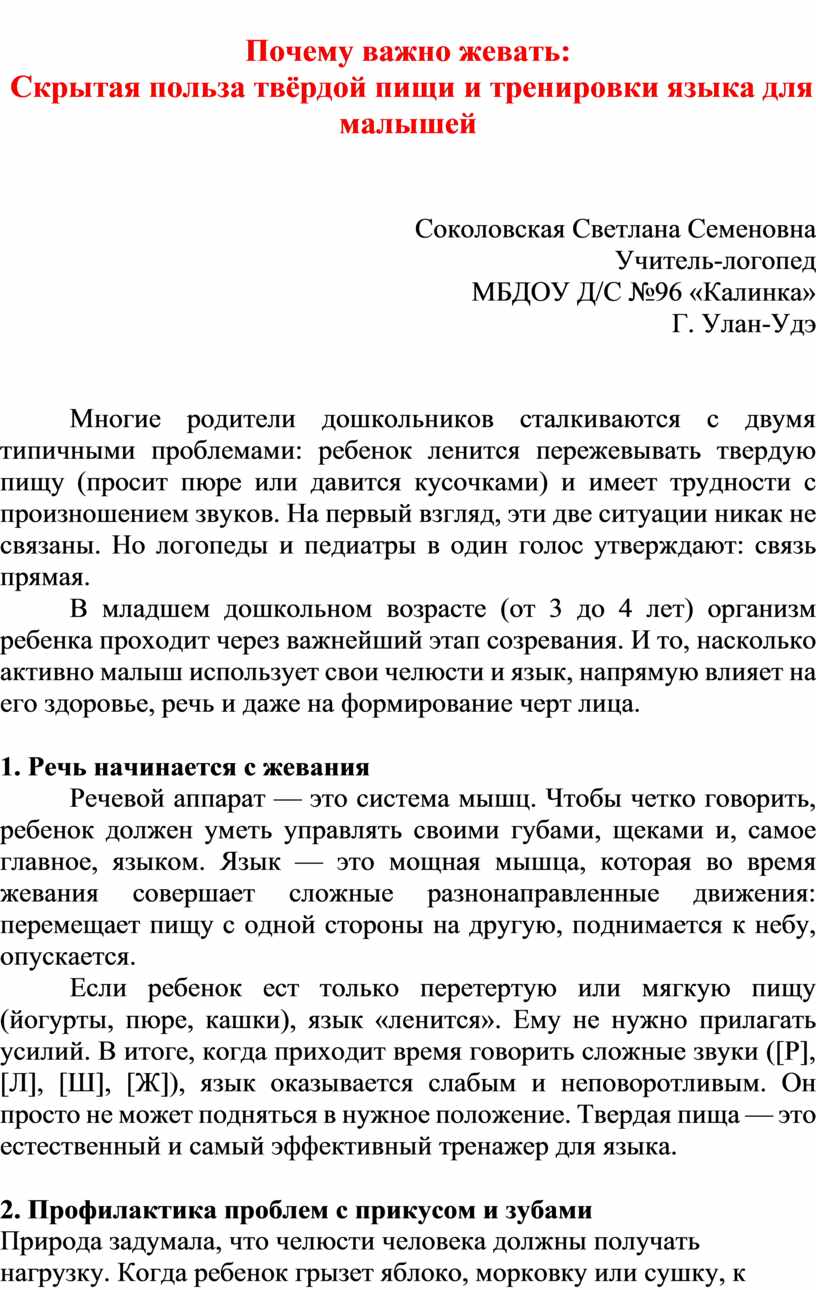 Приучая ребенка к твердой пище в младшем дошкольном возрасте, мы не просто балуем его «взрослыми» угощениями. Мы закладываем фундамент его чистой речи, правильного прикуса и здорового развития. Тренируйте маленькие язычки — и результат не заставит себя ждать!