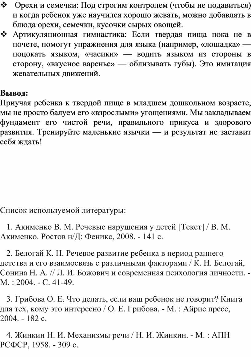 v Артикуляционная гимнастика: Если твердая пища пока не в почете, помогут упражнения для языка (например, «лошадка» — поцокать языком, «часики» — водить языком из стороны в сторону, «вкусное варенье» — облизывать губы). Это имитация жевательных движений.
