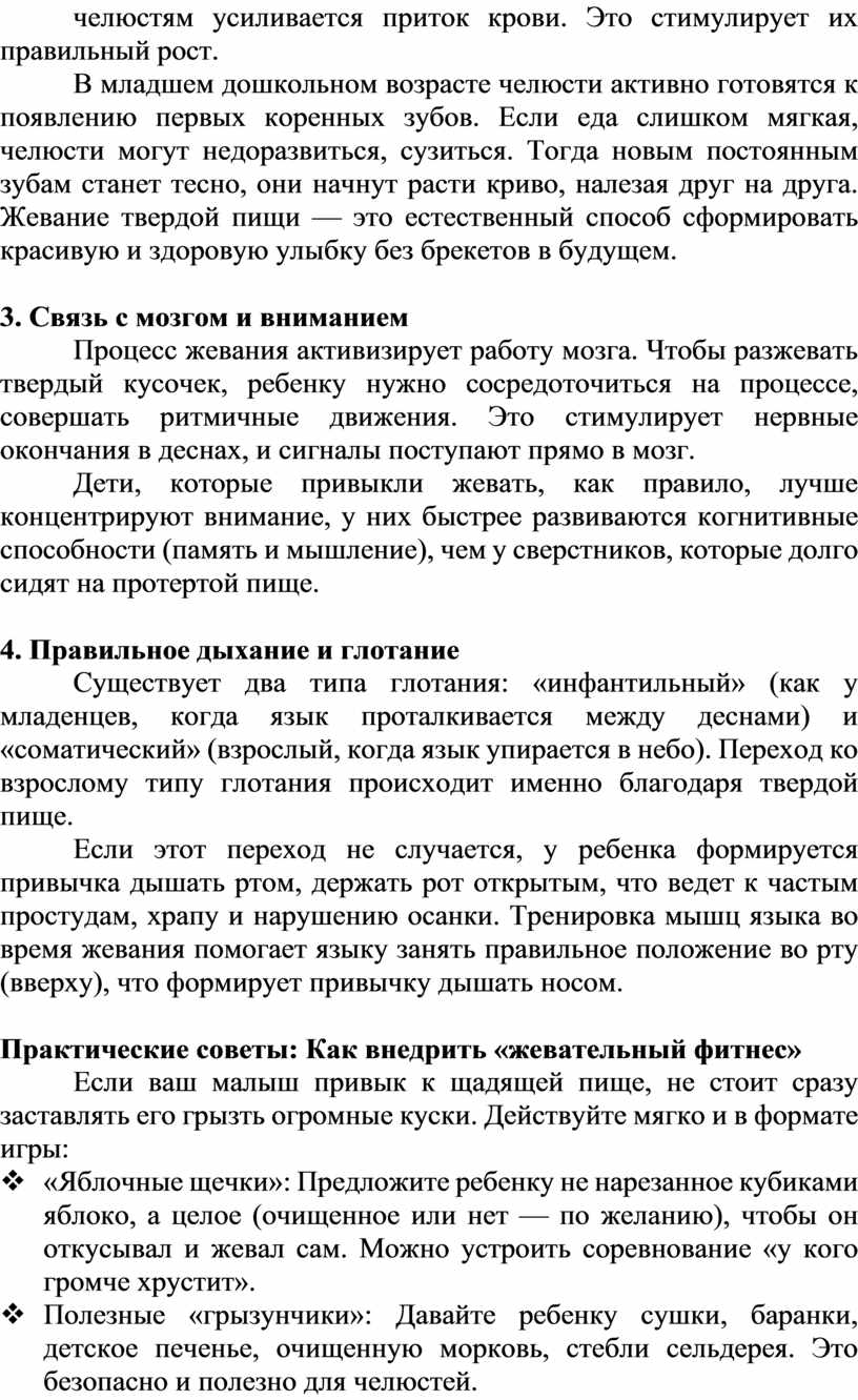 В младшем дошкольном возрасте (от 3 до 4 лет) организм ребенка проходит через важнейший этап созревания. И то, насколько активно малыш использует свои челюсти и язык, напрямую влияет на его здоровье, речь и даже на формирование черт лица.