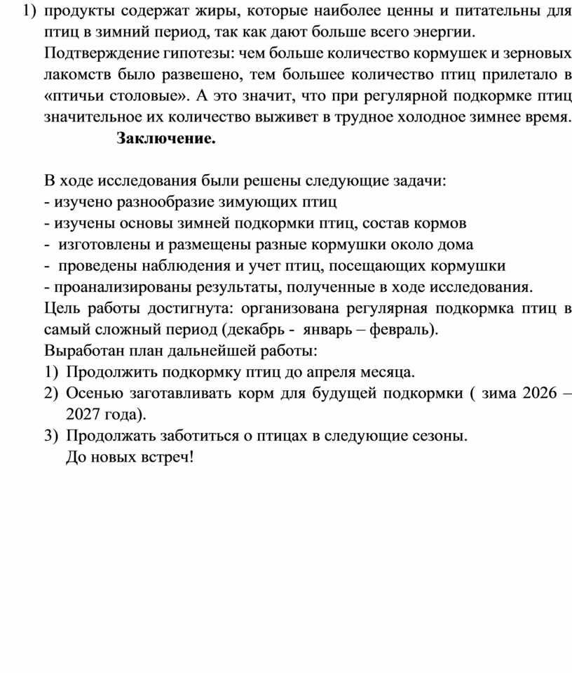 Цель работы достигнута: организована регулярная подкормка птиц в самый сложный период (декабрь - январь – февраль).
