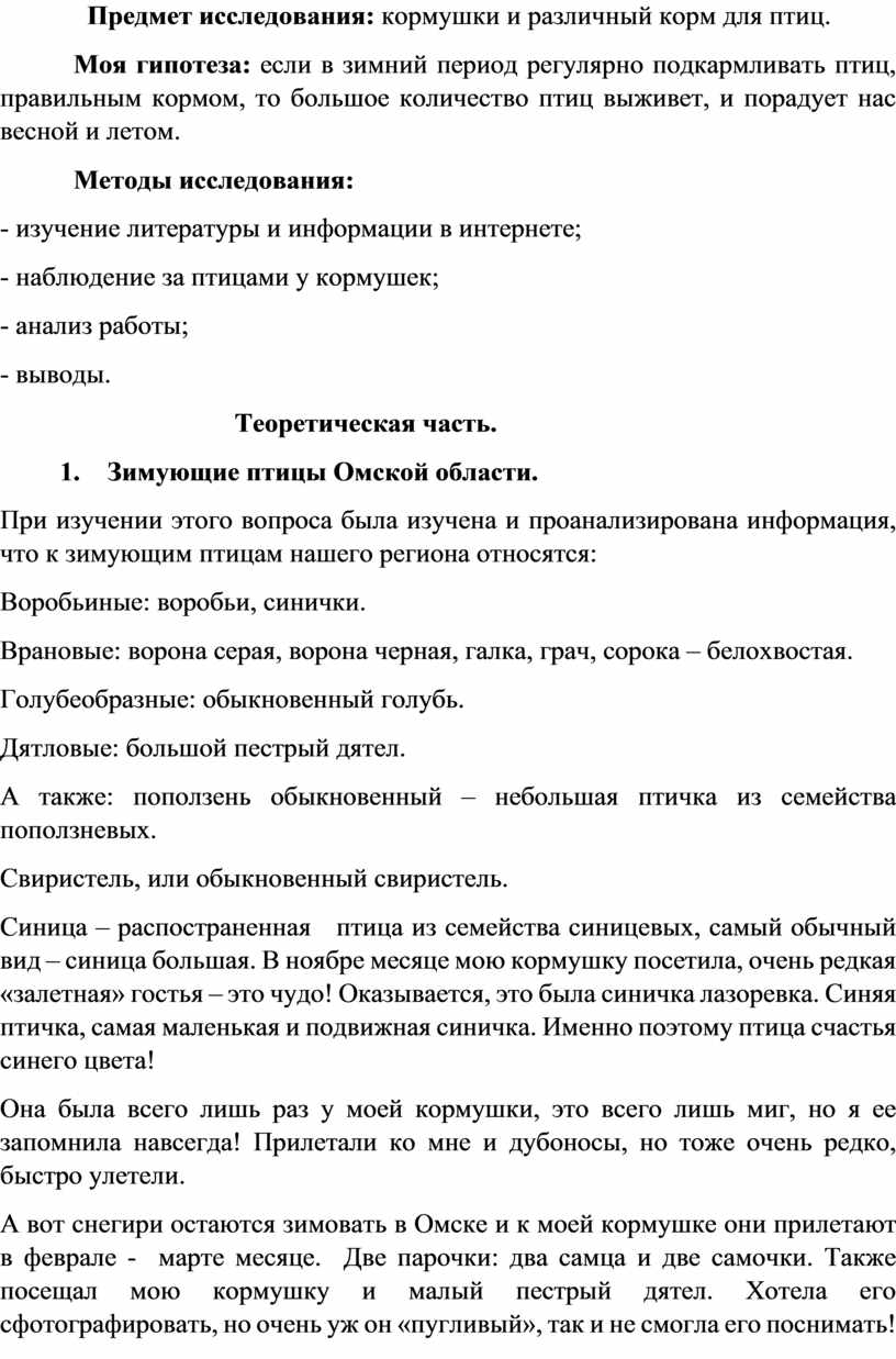 Объект исследования: зимующие птицы Омской области (г. Омска).