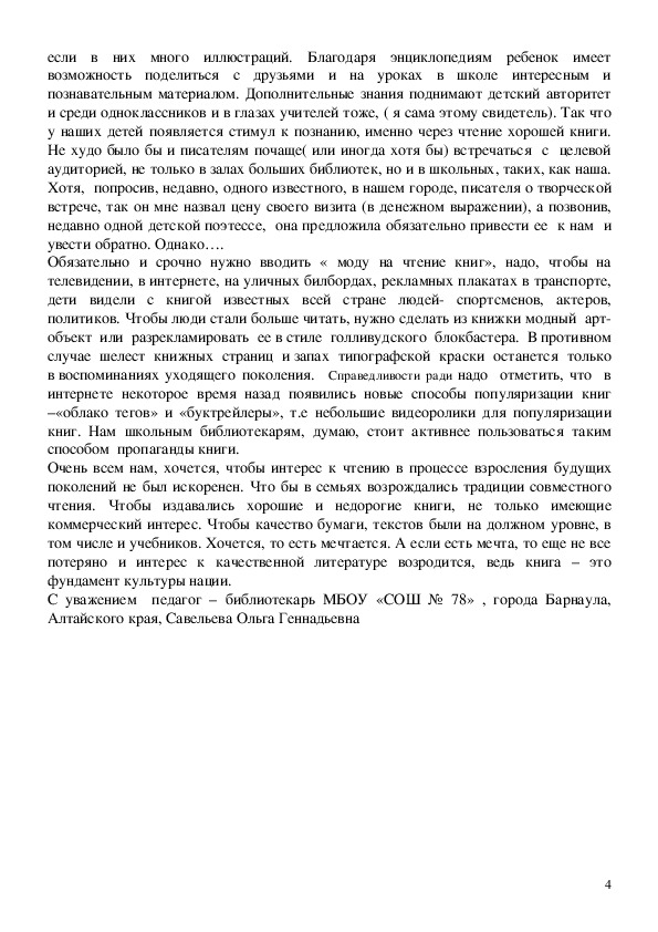 С уважением педагог – библиотекарь МБОУ «СОШ № 78» , города Барнаула,
