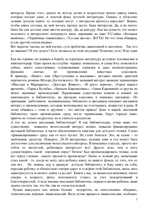 Когда-то о гражданах страны Советов говорили, что мы – самая читающая нация. Возможно, так было, однако как дела обстоят теперь? Вот уже многие годы ребенка с малых лет принято учить читать. Теперь мы воспринимаем этот воспитательный момент вполне нормально, естественно. Вокруг нас много грамотных людей, другое дело степень грамотности. Достичь высокой степени грамотности, на мой взгляд, можно только через чтение книг! А как быть, если дети не хотят читать? Я, уже довольно долго работаю в библиотеке, вижу разных детей и понимаю, что на сегодняшний день это проблема. Пишу вам, чтобы вместе порассуждать на тему: почему дети не читают?