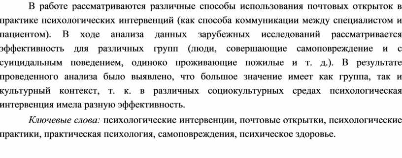 Ключевые слова: психологические интервенции, почтовые открытки, психологические практики, практическая психология, самоповреждения, психическое здоровье.