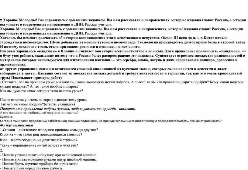 Хорошо. Молодцы! Вы справились с домашним заданием. Вы нам рассказали о направлениях, которые издавна славят Россию, а сегодня вы узнаете о современных направления в ДПИ. Рассказ учителя. Хотелось бы немного рассказать об истории возникновения этого женственного искусства. Около III века до н. э. в Китае начало зарождаться шелководство. Шелк добывали из кокона тутового шелкопряда. Технология производства долгое время была в строгой тайне. И поэтому шелковая ткань стала признаком роскоши и ценилась на вес золота. Впервые зародилось «кандзаси» в Японии и означает оно скорее всего «воткнутое в волосы». Хотя правильнее произносить «Кандзаси», но я буду употреблять «канзаши» потому что в России более распространено это название. Существует огромное множество разновидностей и материалов которые используются для изготовления канзаши — это серебро, олово, латунь и даже черепаховый панцирь, древесина и др.материалы. от других украшений канзаши отличаются сложной аппликацией из кусочков ткани, которые складываются в лепестки и далее собираются в цветы. Канзаши состоит из множества мелких деталей и требует аккуратности и терпения, так как это очень кропотливый труд.( Показывает примеры работ) - Скажите, вот на прошлом уроке мы начали с вами выполнять некий подарок. А знаете ли вы как правильно дарить подарки? Кому какой подарок можно подарить? А что такое вообще подарок? Как вы думаете какая сегодня тема нашего урока?