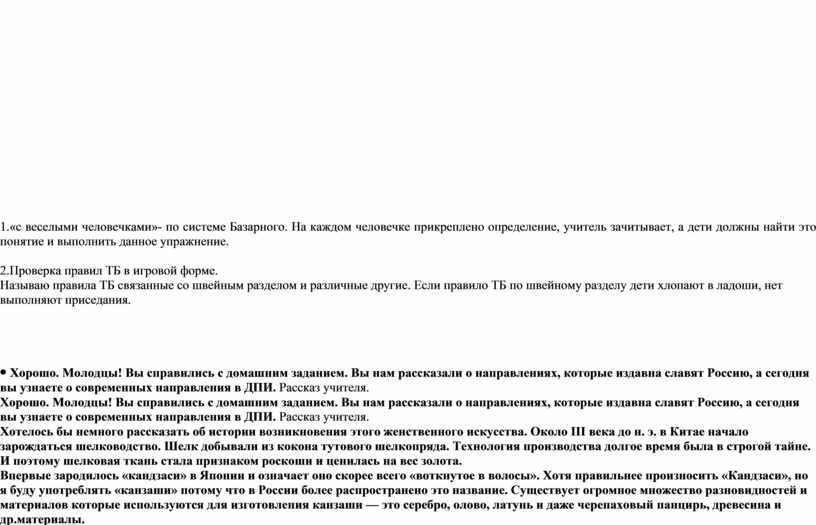 2.Проверка правил ТБ в игровой форме. Называю правила ТБ связанные со швейным разделом и различные другие. Если правило ТБ по швейному разделу дети хлопают в ладоши, нет выполняют приседания.