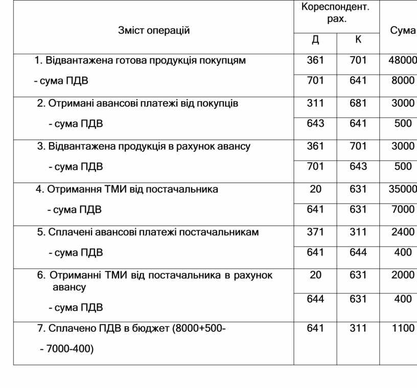 Приклад: Скласти бухгалтерські проводки і визначити суму ПДВ, яка підлягає сплаті до бюджету. За місяць: