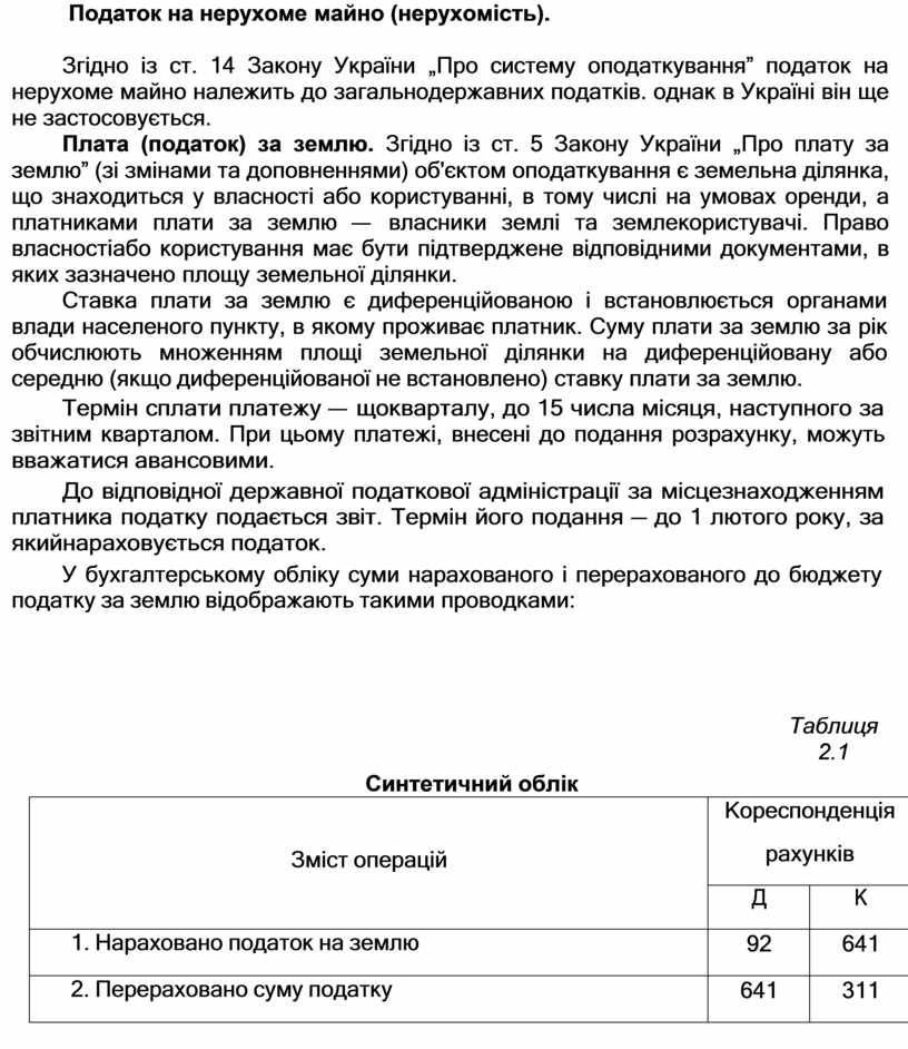 Плата (податок) за землю. Згідно із ст. 5 Закону України „Про плату за землю” (зі змінами та доповненнями) об'єктом оподаткування є земельна ділянка, що знаходиться у власності або користуванні, в тому числі на умовах оренди, а платниками плати за землю — власники землі та землекористувачі. Право власності або користування має бути підтверджене відповідними документами, в яких зазначено площу земельної ділянки.