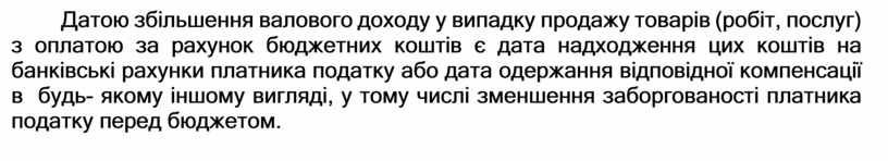 Датою збільшення валового доходу у випадку продажу товарів (робіт, послуг) з оплатою за рахунок бюджетних коштів є дата надходження цих коштів на банківські рахунки платника податку або дата одержання відповідної компенсації в будь- якому іншому вигляді, у тому числі зменшення заборгованості платника податку перед бюджетом.