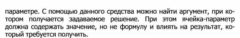 параметре. С помощью данного средства можно найти аргумент, при ко- тором получается задаваемое решение. При этом ячейка-параметр должна содержать значение, но не формулу и влиять на результат, ко- торый требуется получить.