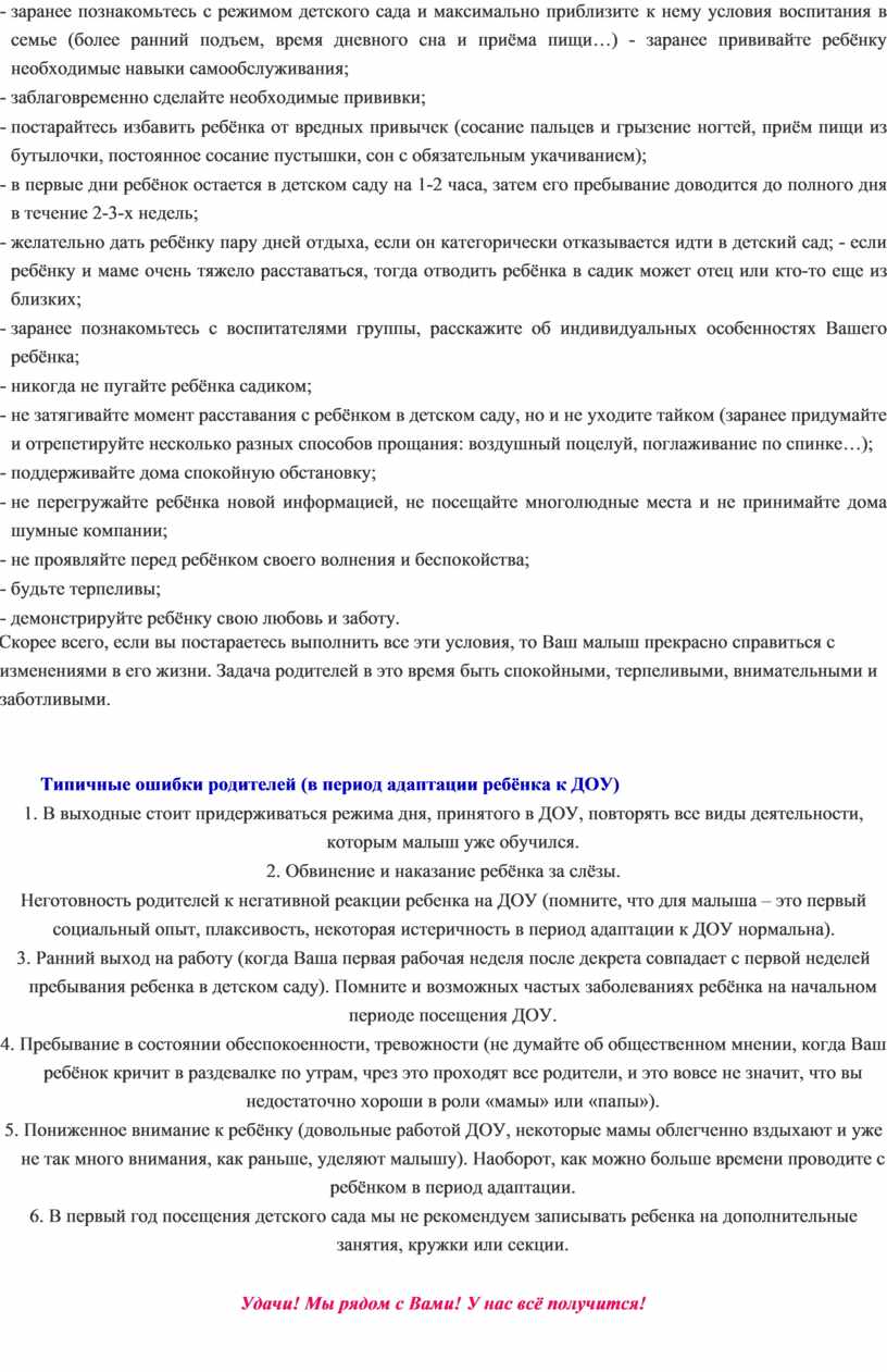 · условий жизни в семье. Это создание режима дня в соответствии с возрастом и индивидуальными особенностями, формирование у детей умений и навыков, а также личностных качеств (умение играть с игрушками, общаться со взрослыми и детьми, самостоятельно обслуживать себя и т.д.). Если ребенок приходит из семьи, где не были созданы условия для его правильного развития, то, естественно, ему будет очень трудно привыкать к условиям дошкольного учреждения.