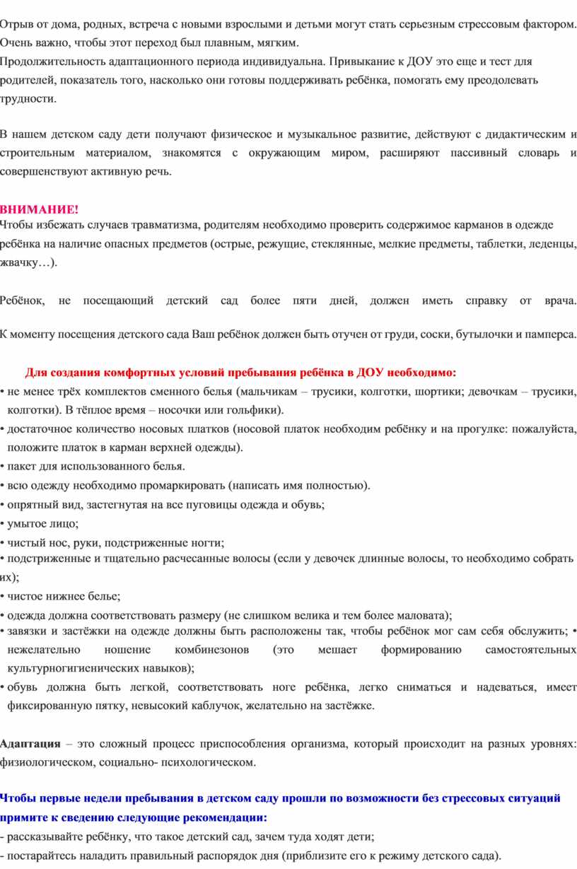 · уровня тренированности адаптационных механизмов, опыта общения со сверстниками и взрослыми. Тренировка механизмов не происходит сама по себе. Необходимо создавать условия, которые требуют от ребенка новых форм поведения. Малыши, которые до поступления в детский сад неоднократно попадали в разные условия (посещали родственников, знакомых, выезжали на дачу и т.п.), легче привыкают к дошкольному учреждению. Важно, чтобы в семье у ребенка сложилось доверительные отношения со взрослыми, умение положительно относится к требованиям взрослых.