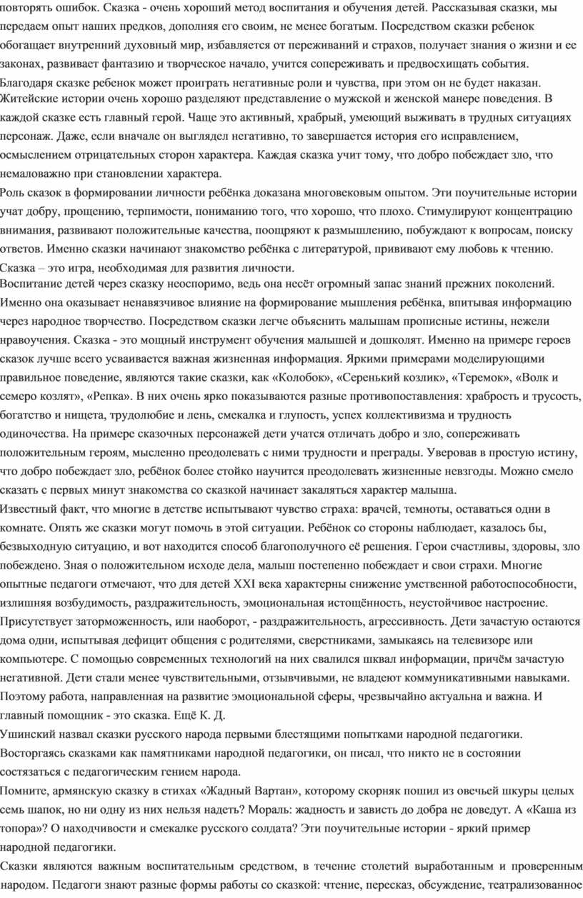 Ушинский назвал сказки русского народа первыми блестящими попытками народной педагогики. Восторгаясь сказками как памятниками народной педагогики, он писал, что никто не в состоянии состязаться с педагогическим гением народа.