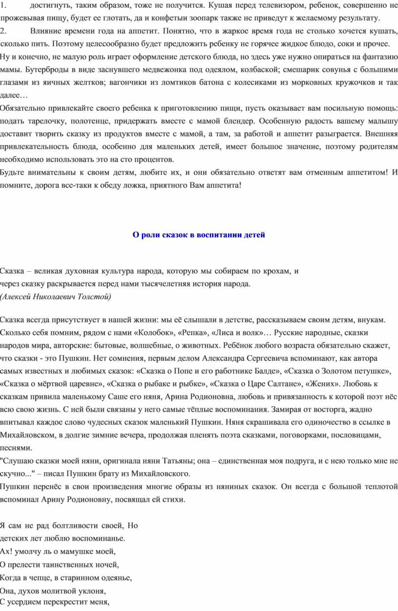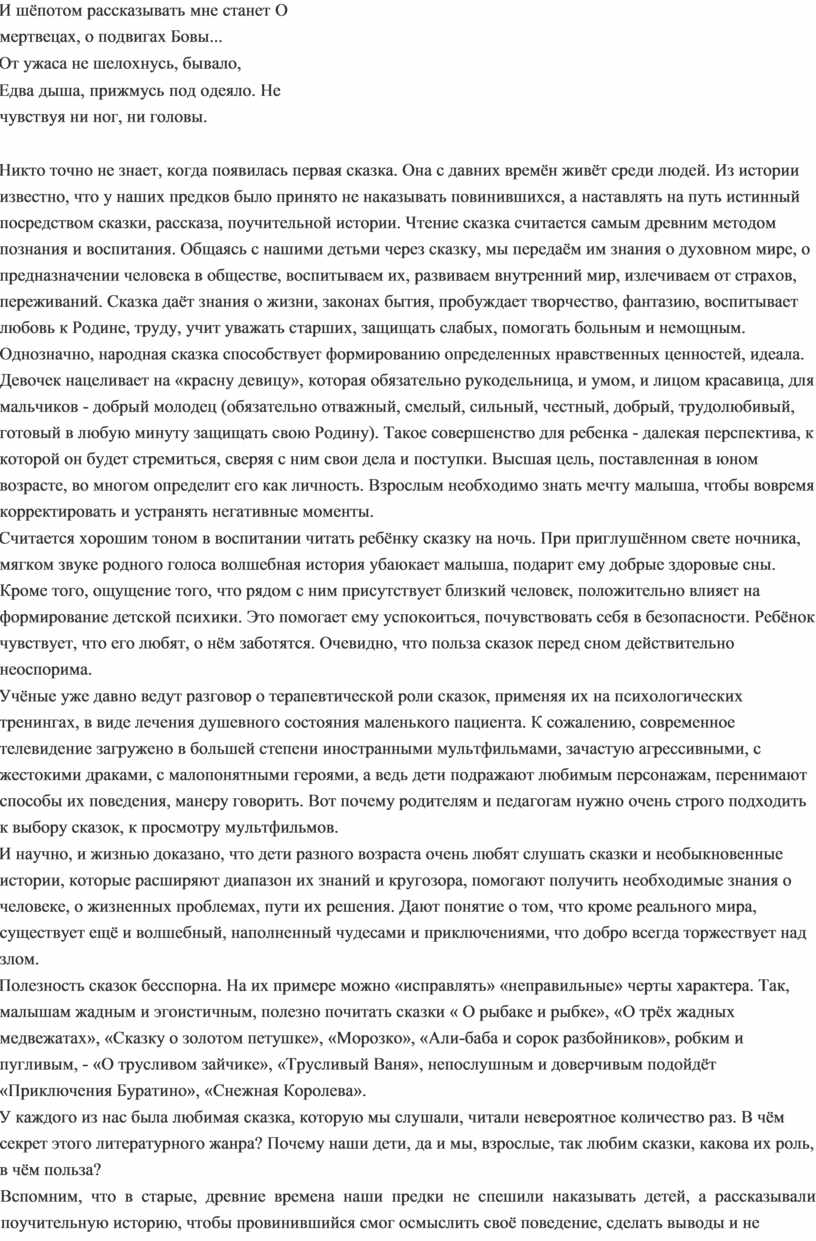 Роль сказок в формировании личности ребёнка доказана многовековым опытом. Эти поучительные истории учат добру, прощению, терпимости, пониманию того, что хорошо, что плохо. Стимулируют концентрацию внимания, развивают положительные качества, поощряют к размышлению, побуждают к вопросам, поиску ответов. Именно сказки начинают знакомство ребёнка с литературой, прививают ему любовь к чтению.