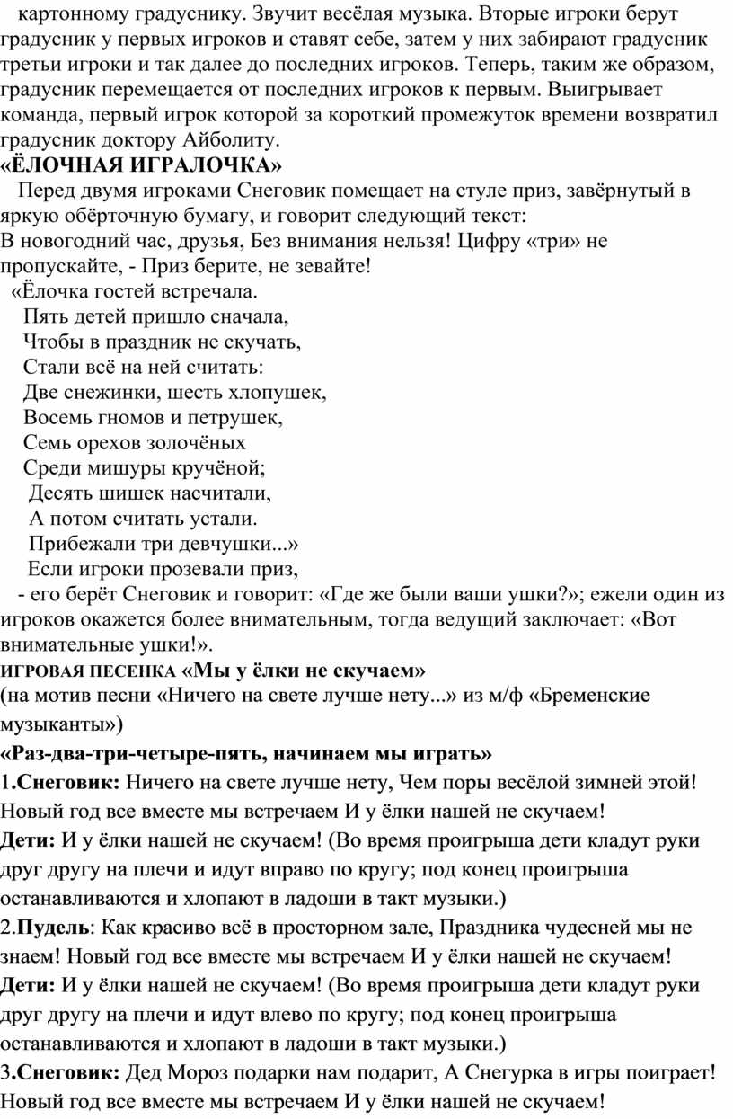 Дети образуют 2 команды и становятся в шеренги. Доктор Айболит хочет узнать - не поднялась ли у кого температура во время новогоднего праздника и ставит под мышки первым участникам обеих команд по большому картонному градуснику. Звучит весёлая музыка. Вторые игроки берут градусник у первых игроков и ставят себе, затем у них забирают градусник третьи игроки и так далее до последних игроков. Теперь, таким же образом, градусник перемещается от последних игроков к первым. Выигрывает команда, первый игрок которой за короткий промежуток времени возвратил градусник доктору Айболиту.